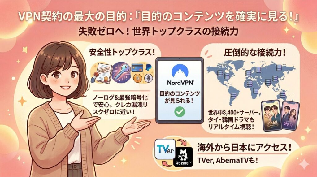 VPNを契約する最大の目的は、「目的のコンテンツが確実に見られるか」ですよね。