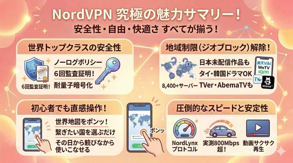 しかし、動画ストリーミングの安定性、サーバーの数、そしてアプリの使い勝手という「実用性」においては、NordVPNが圧倒的です。