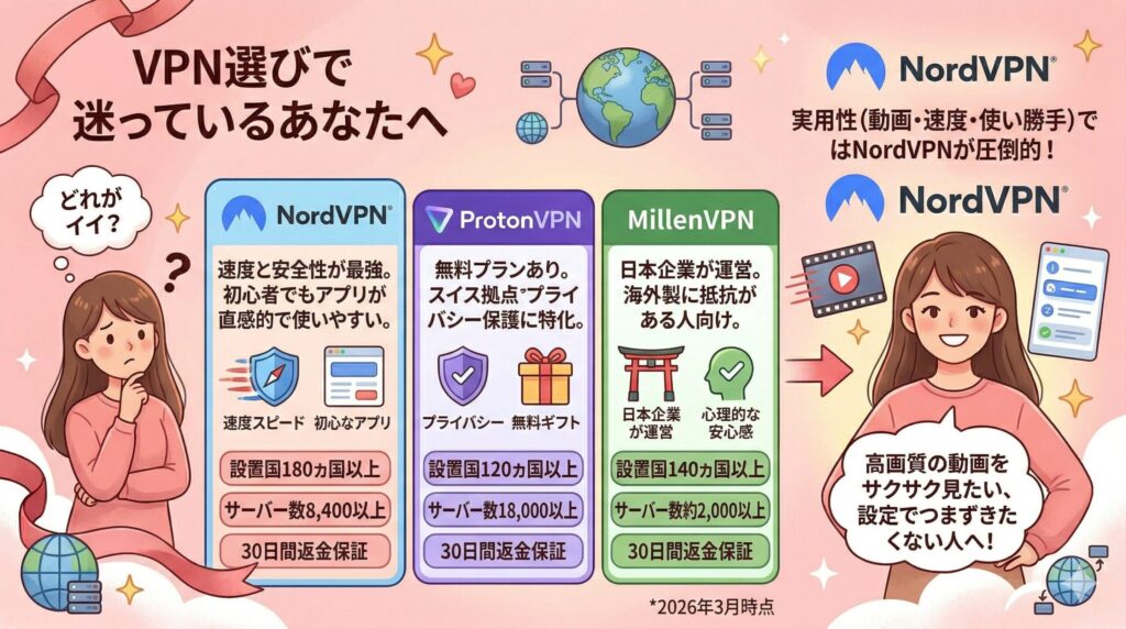 NordVPN vs 競合サービス(ProtonVPN・MillenVPN)