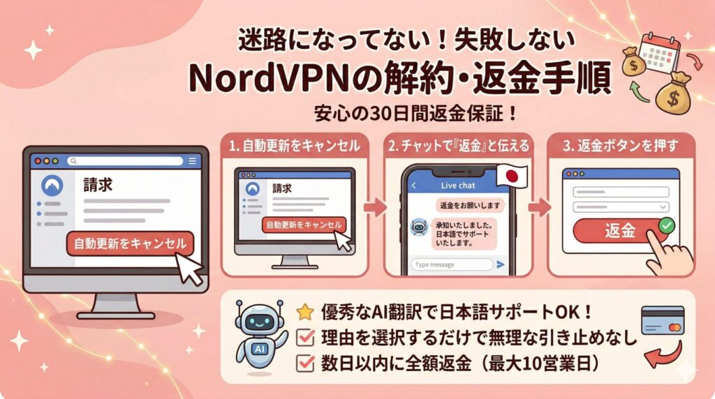 でもNordVPNの解約・返金手順は、公式ページでも画像付きで明記されている通り、拍子抜けするほど簡単で明確です。