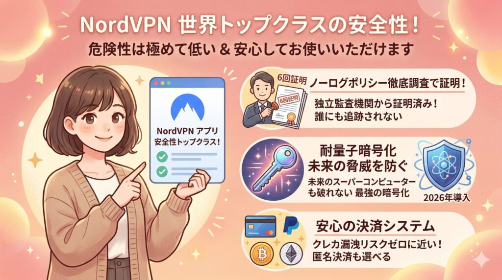 結論から言うと、NordVPNの危険性は極めて低く、世界トップクラスの安全性を誇ります。